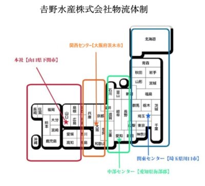 物流体制について 全国への物流体制吉野水産株式会社は、山口県下関市の自社工場で製造した水産加工製品を、迅速に的確にお届けする為に、日本全国を網羅した物流体制を整えています。西日本地域本社【山口県下関市】関西地域関西センター【大阪府茨木市】中部地域中部センター【愛知県海部郡】北日本地域関東センター【埼玉県川口市】水産加工製品に関することはお気軽にお問い合わせください!083-267-0004平日・土曜日9:00〜17:00(水日祝は休み)お問い合わせメールは24時間受け付けております。